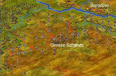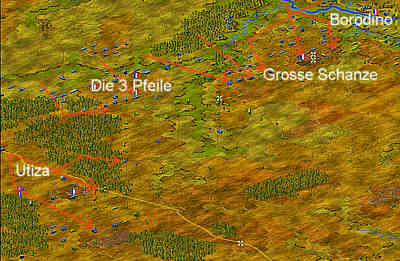 BORODINO Es ist der 07.September 1812 11.45 Uhr. Eine der blutigsten Schlachten der napoleonischen Zeit hat vor wenigen Stunden begonnen. Hier ist es mir als Befehlshaber der Franzosen gelungen, tiefe Einbrüche in die russischen Stellungen zu erzielen. Die extreme 3D-Verkleinerungsansicht zeigt, dass bereits Utiza, die 3 Pfeile und Borodino eingenommen sind. Mit dem Einbruch in die Grosse Schanze geht die Schlacht für die Russen verloren. Nichts kann danach die Franzosen mehr aufhalten. Die roten Pfeile zeigen die Angriffsrichtungen der Truppen Napoleons. |